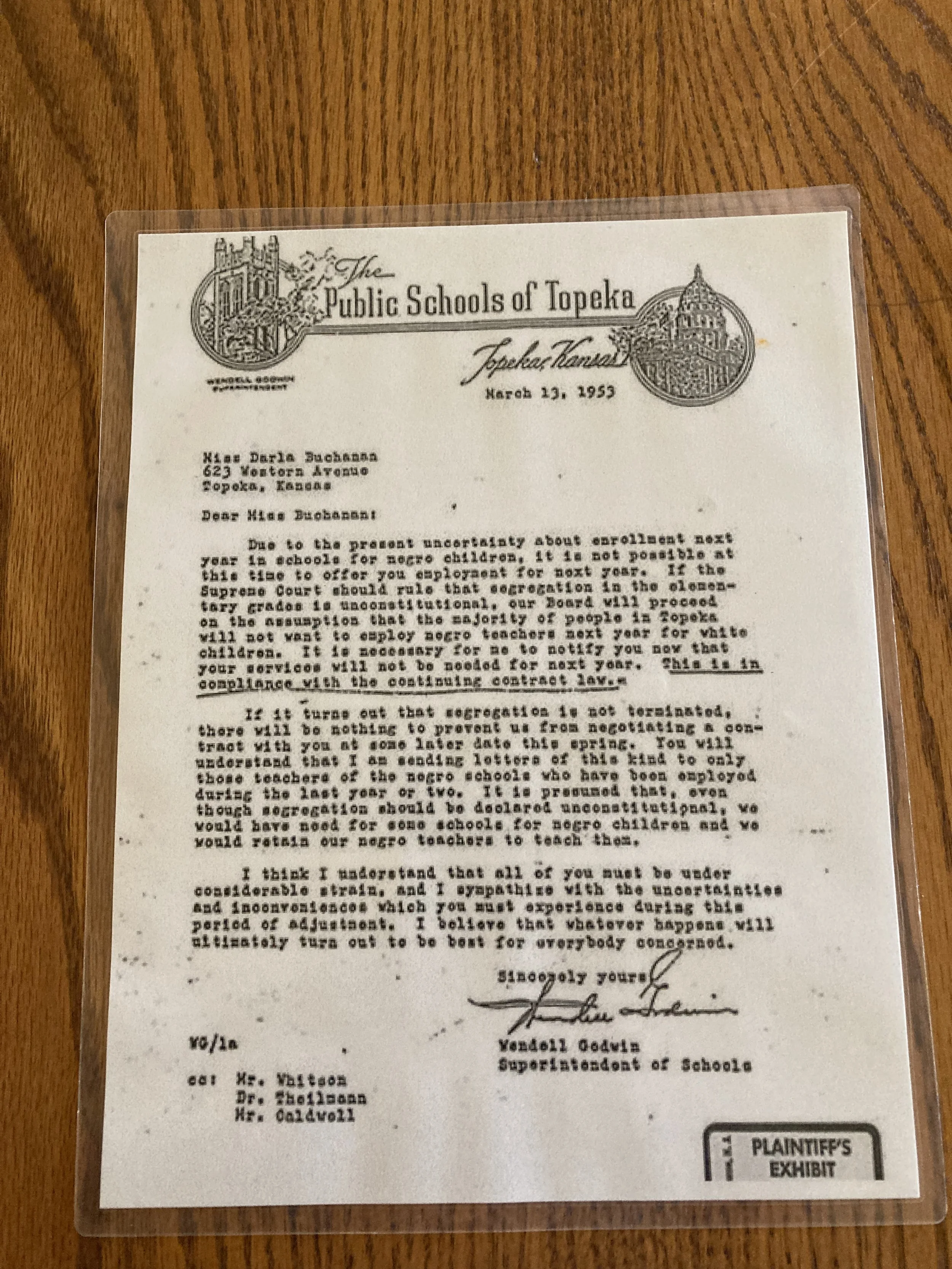 There is a letter in the Kindergarten room to a black teacher that was teaching around the time that the Brown vs Board of Education case was going through the courts. The school district was letting her go because they said once the schools were integrated that white parents would not want their children taught by black teachers. It goes on to say that if segregation is not decided to be unconstitutional then they would negotiate a contract with teachers at that time. I would have students read this primary resource and then I think this could be used as part of a socratic seminar. The questions that would guide the discussion would be dependent on the age of the students participating and the unit being covered. My hope is that students would have the opportunity to think about the Brown vs Board of Education case from the perspective of black teachers who were teaching when this case went through the courts.